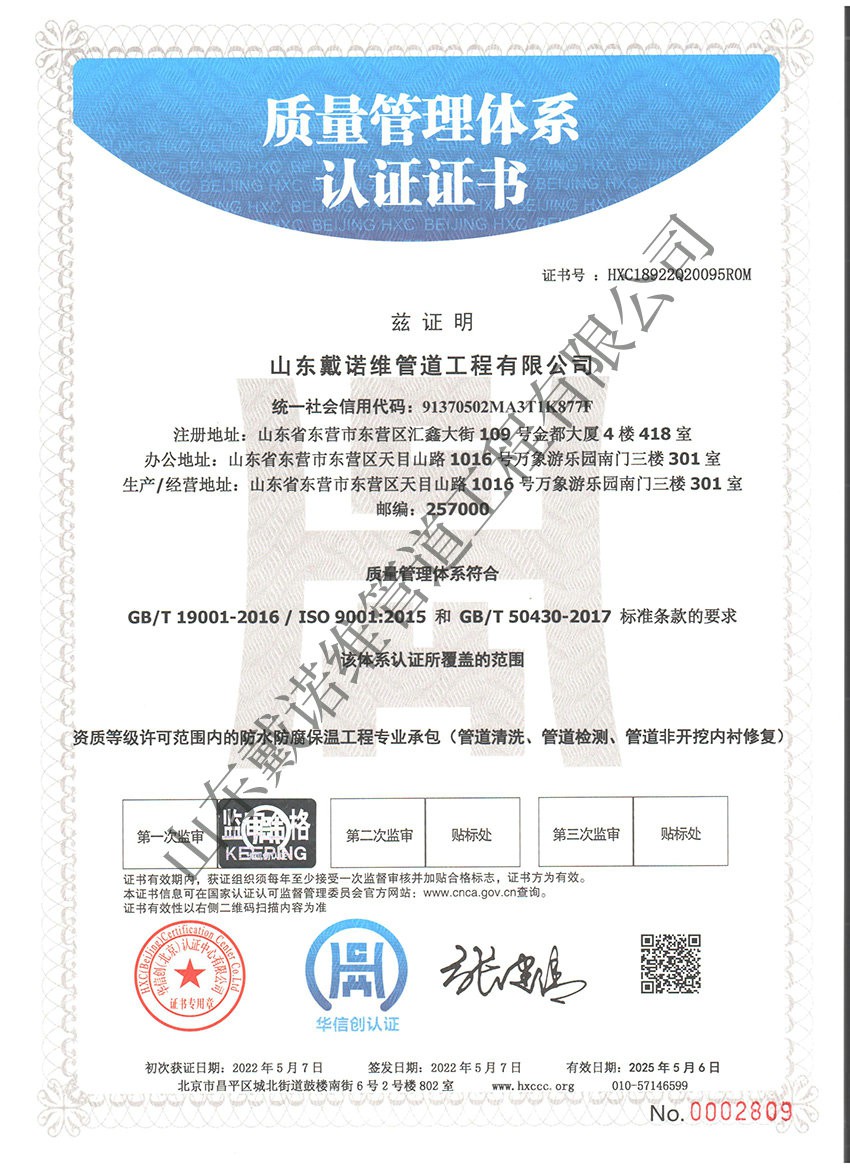 管道非開挖修復工程服務企業資質證書